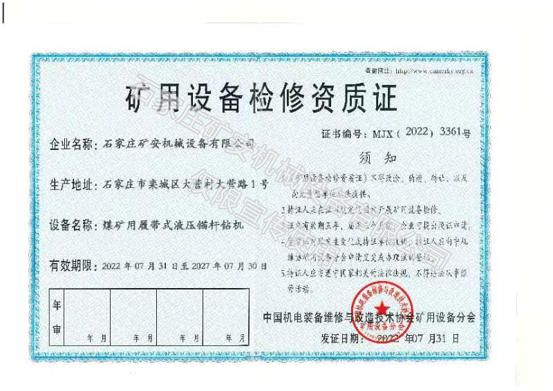 • 礦用設備檢修資質(zhì)證